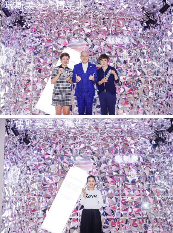 瑞斯美展位中与「发光精华水」贴切呼应的打卡墙,展现出耀眼夺目的视觉效果,