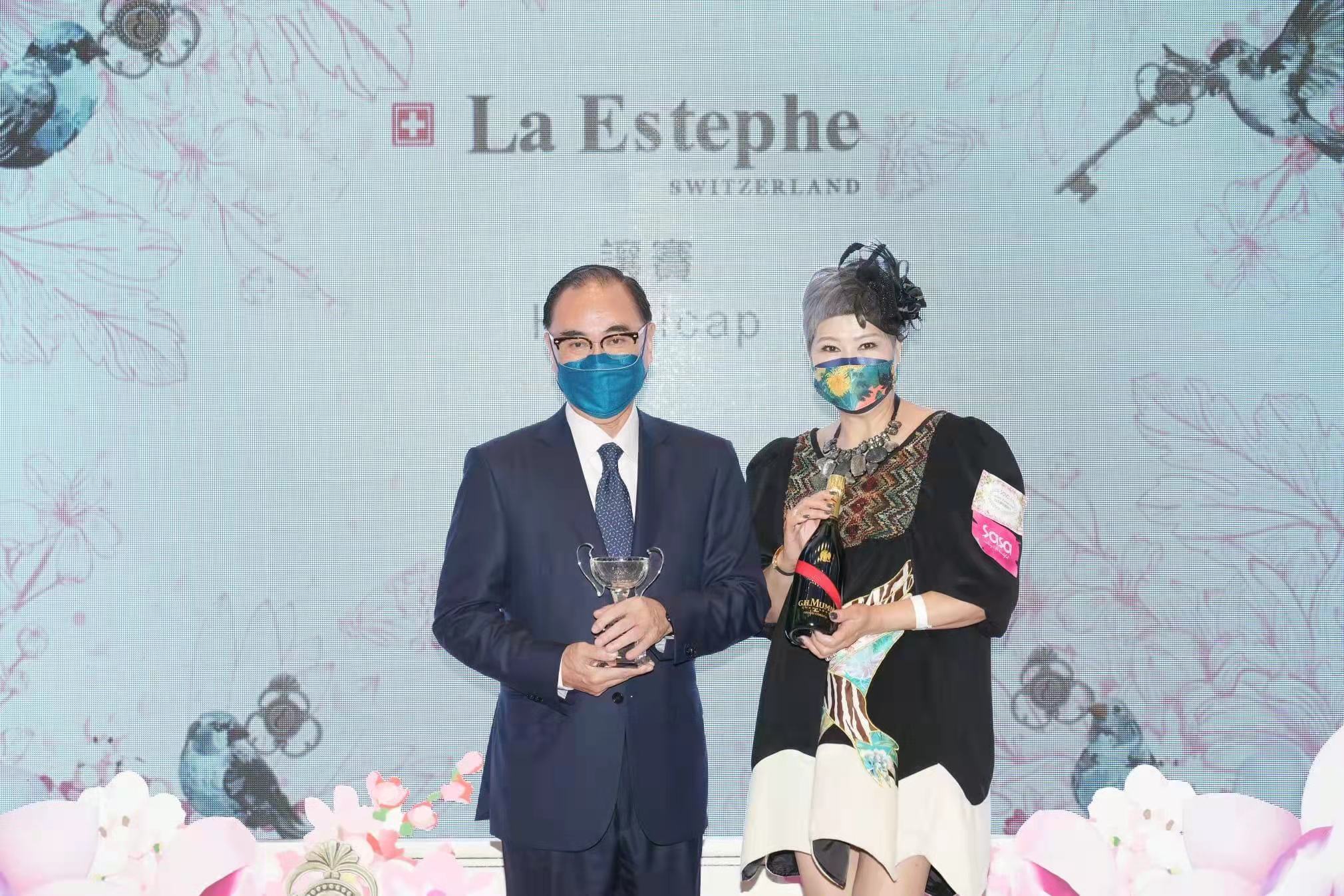 ▲香港分公司总经理何少芳女士与获得“La Estephe瑞斯美杯” 的马主罗建生先生合影