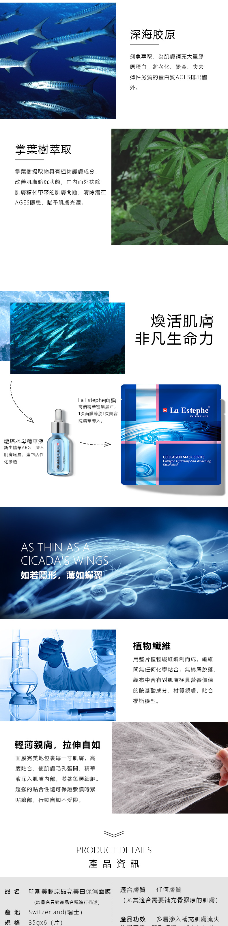 多層滲入補充肌膚流失的膠原質,緊實保濕,减少幼細紋,恢復飽滿彈性