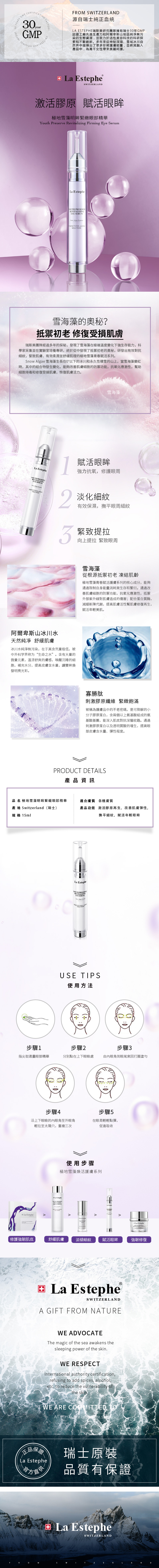 以極地雪海藻為基礎,輔以小分子冰川水導入,增加肌膚抵抗力,添加寡勝肽, 激活膠原再生,改善肌膚彈性,撫平細紋,賦活年輕眼眸。